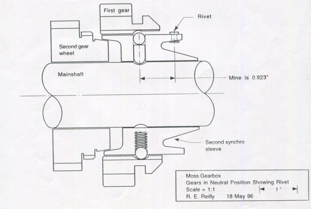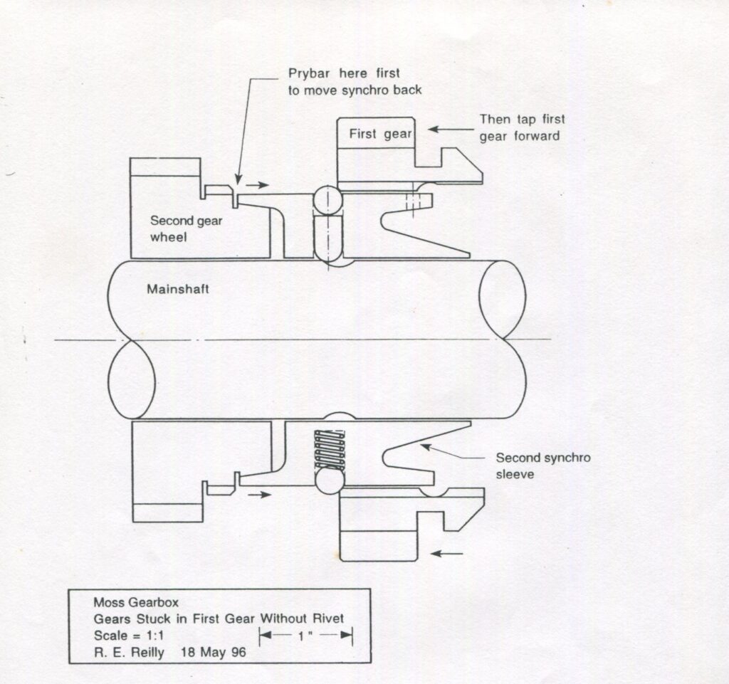 The gearbox should be filled to the dipstick mark with SAE 30 or SAE 10W30 engine oil. Do not use SAE 90 gear lube because it will hinder the smooth operation of the synchronizers. Stuck in First Gear? The Moss gearbox as originally installed in 1954 and earlier cars has a fundamental design flaw that only causes a problem after the gears become rather worn. The problem is that it gets stuck in first gear. It is particularly common on the XK120, as some drivers had the habit of speed shifting and chirping second gear, but it can happen on Mark V, VII and other earlier and later models as well.